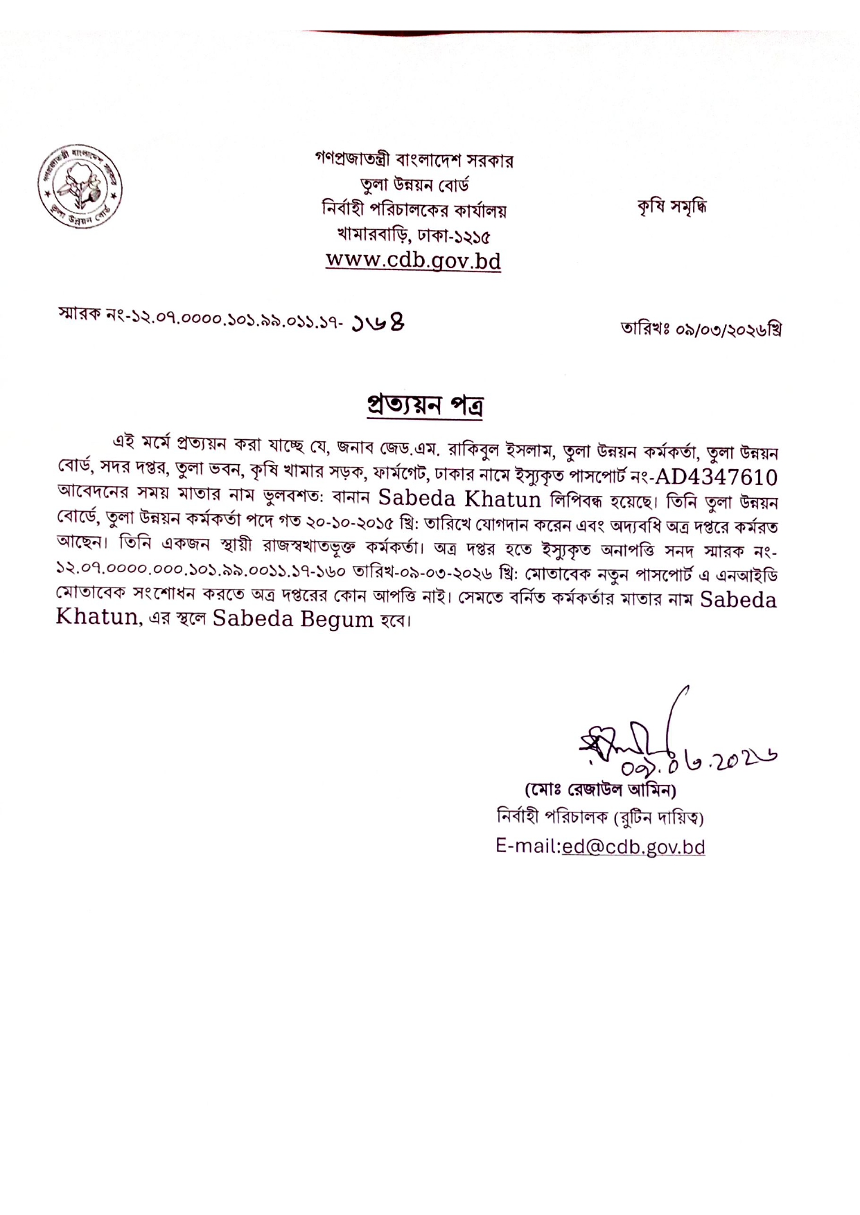 | ১ | জেড. এম. রাকিবুল ইসলাম, তুলা উন্নয়ন কর্মকর্তা এর মায়ের নামের বানান সংশোধনের প্রত্তয়নপত্র, ১৬৪,০৯/০৩/২০২৬ | | | দেখুন |