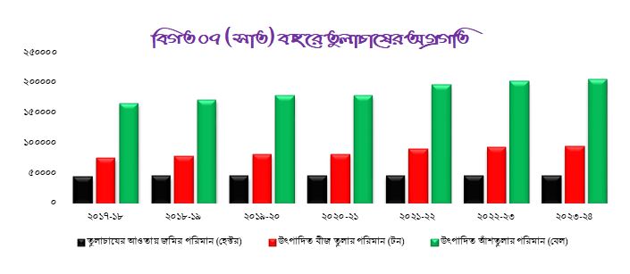 | অর্থ বছর | তুলাচাষের আওতায় জমির পরিমান (হেক্টর) | উৎপাদিত বীজ তুলার পরিমান (টন) | উৎপাদিত আঁশতুলার পরিমান (বেল) |