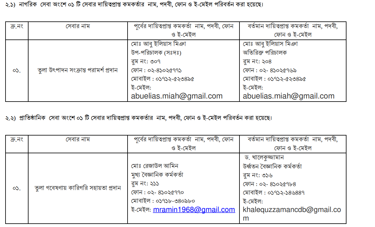 | 2 | তুলাচাষে কারিগরি সহায়তা প্রদান | প্রাতিষ্ঠানিক প্রস্তাব/সমঝোতা | সমঝোতা স্মারক | বিনামূল্যে | ৩০ কার্যদিবস | ড. শেফালী রানী মজুমদার অতিরিক্ত পরিচালক ফোন : ০২-৫৫০২৮৪১৫ মোবাইল : ০১৭১১০২০০২৩ ই-মেইল: shefalimozumder@yahoo.com |
