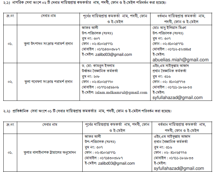 | 1 | তুলার বালা্াইনাশক, ট্রায়ালের অনুমোদন | পত্রজারী | সাব-পিটাকের সুপারিশসহ আবেদনপত্র | বিনামূল্যে (তবে সংশ্লিষ্ট গবেষণা কেন্দ্রে ট্রায়াল স্থাপনের জন্য সেবা গ্রহণকারীকে খরচ বহন করতে হবে) | ১০ কার্য দিবস | জাফর আলী উপ-পরিচালক ফোন : ৯১১১৪৭৬ মোবাইল : ০১৭১৪৩০৩৮৮৭ ই-মেইল: zalibd03@gmail.com |